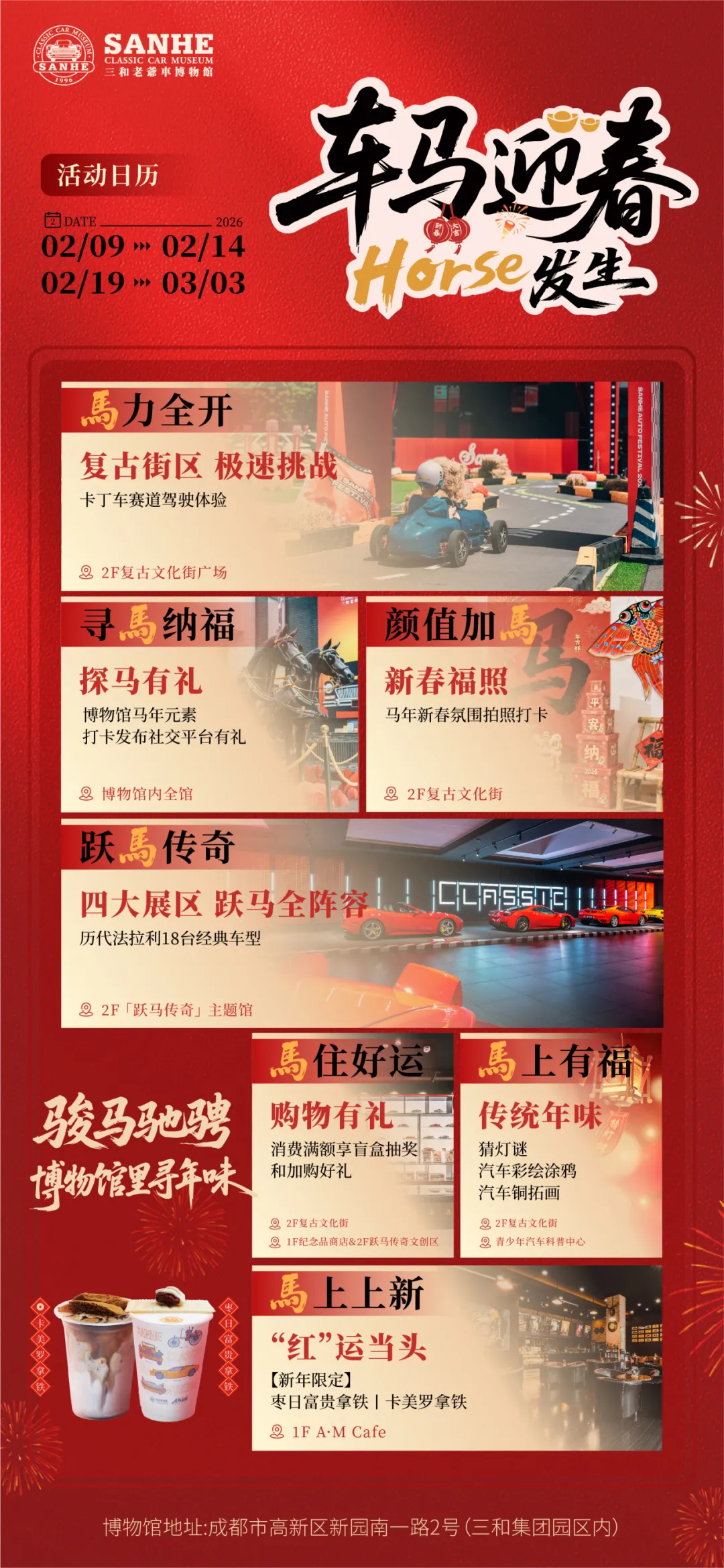 复古车轮遇见新春特调,一杯“红”运,满口甜蜜!这个新春,老爷车博物馆咖啡厅将时光的醇厚与新年的暖甜交融,特推出新春限定风味,伴您在古董车的环绕中,尝一份独特的年意。