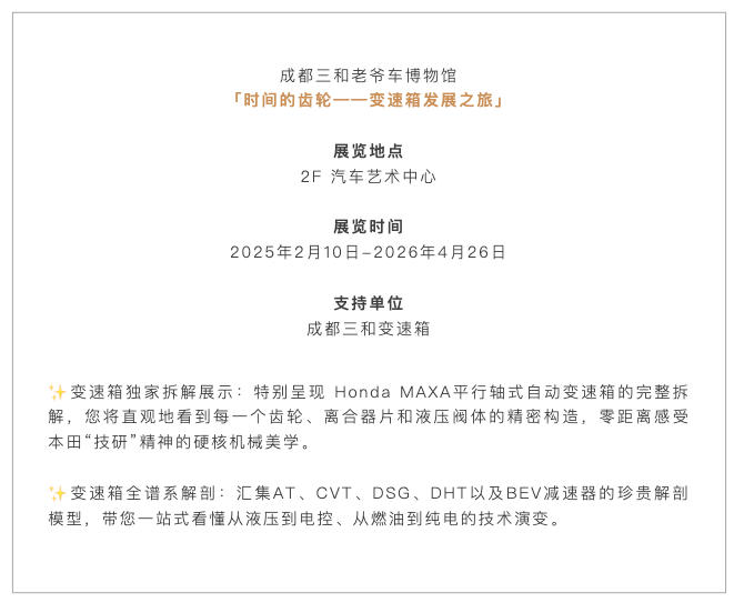读完这段变速箱的进化史,您是否想亲眼见证这些机械奇迹?我们诚挚邀请您走进「时间的齿轮——变速箱发展之旅」主题展览,探索这颗“机械心脏”的真实脉络。
